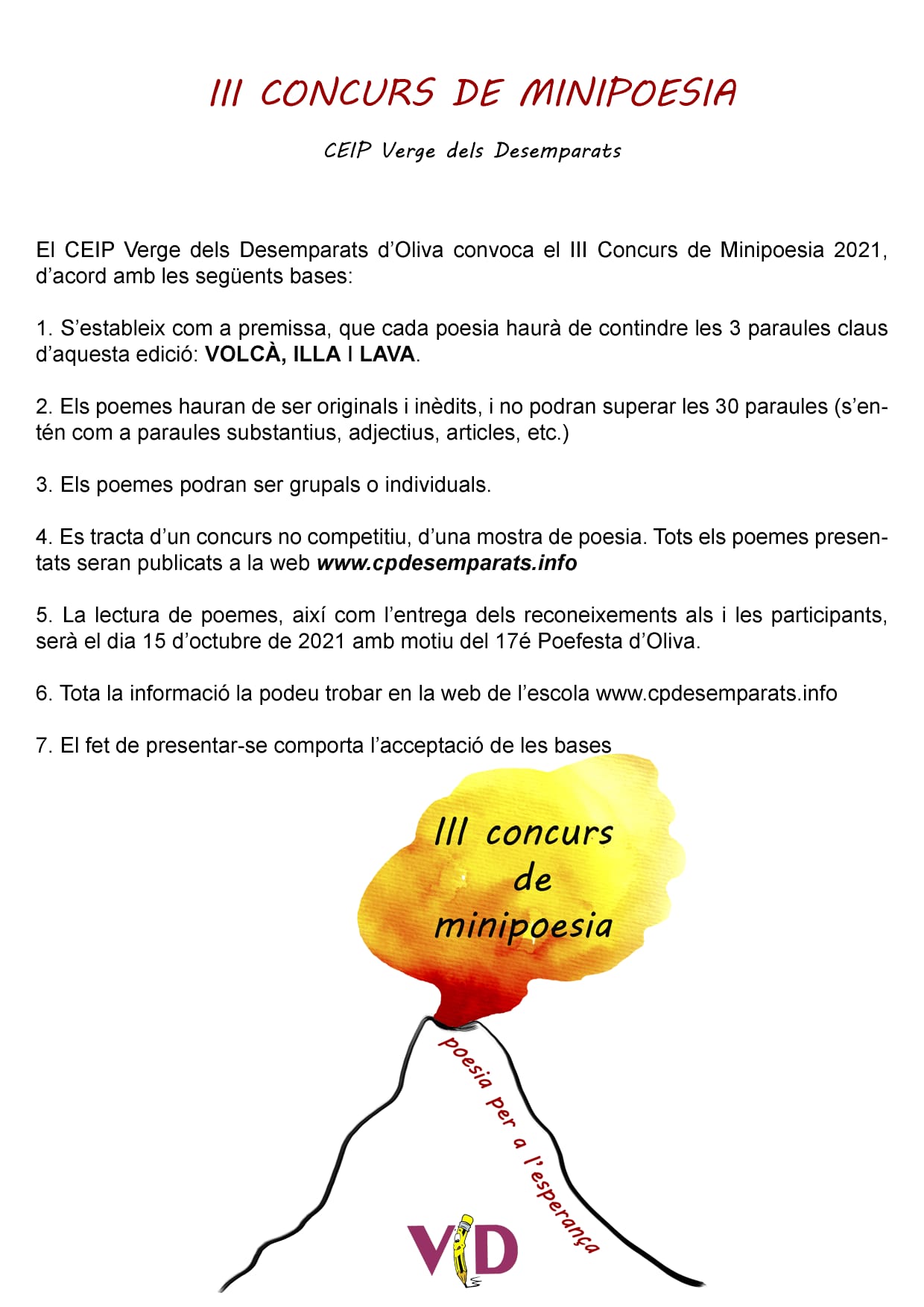 Llancem el III concurs de minipoesia aprofitant la celebració del 17é Poefesta d'Oliva. Aquesta edició la volem dedicar als damnificats del volcà de Las Palmas, realitzant poesia per a l'esperança. Ho celebrarem el proper divendres 15 d'octubre de 2021.